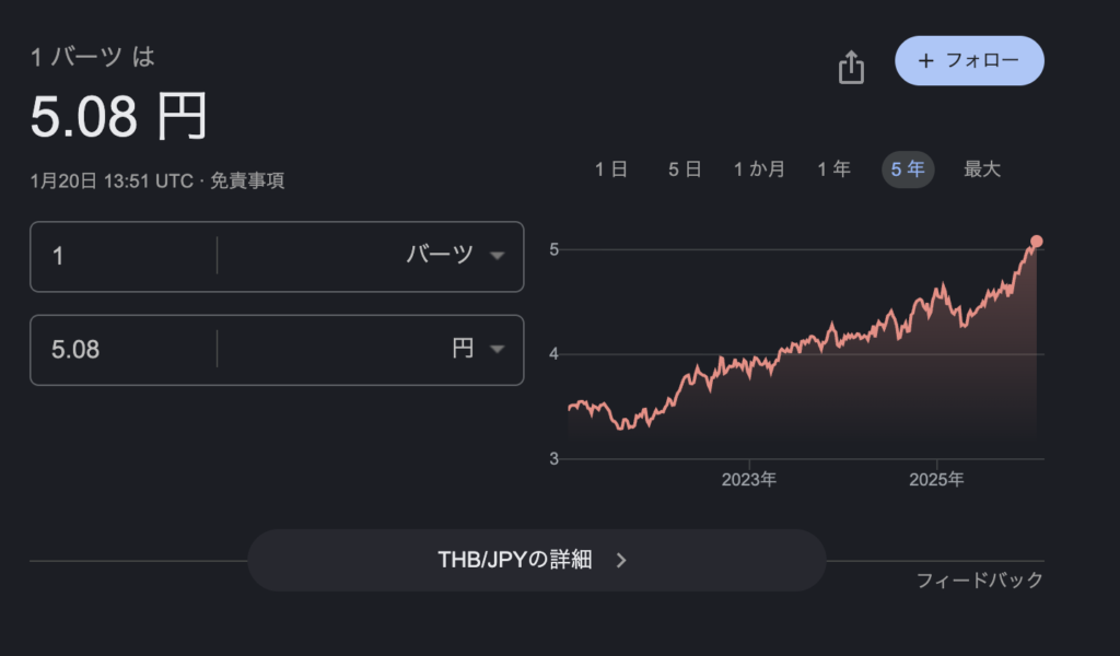 それもそのはず。バーツの価値は筆者が住んでいた4円時代(2022年8月〜2024年7月)から25%上昇。さらにタイ国内のインフレだって進んでいる。